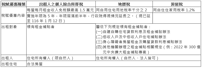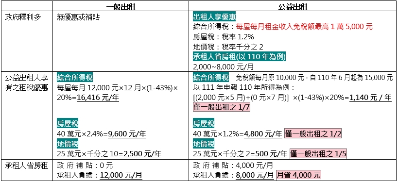 假設內容:本表以租金補貼每月4,000元,租金12,000元/月,房屋現值40萬元,課稅地價25萬元,房東所得稅率20%,其他供住家使用房屋稅率2.4%為例。