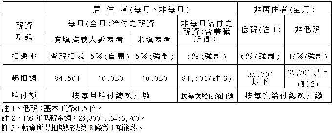 - 109年度不同型態薪資所得之扣繳規定彙整如下(請貴企業依法完成扣繳義務,以免受罰)。